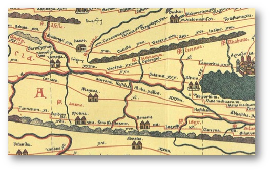 L’importanza di Hostilia è confermata anche dall’itinerario di Antonino – un registro delle stazioni e delle distanze tra le località poste sulle diverse strade dell’Impero romano, registro probabilmente redatto alla fine del III secolo o agli inizi del IV – e dalla Tavola Peutingeriana, copia di un’antica carta romana che mostra le vie militari dell’Impero (vedi foto 5: le principali vie romane della Pianura padana e cerchiato in rosso Hostilia; vedi foto 6, cerchiate in rosso Mantua e Hostilia sulla Tavola Peutingeriana).