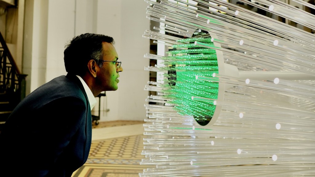 The relation between art and artificial intelligence is at the centre of the Suchi Reddy’s work. She has built a light structure commissioned by Amazon Web Services (AWS), precisely «a two-story light-filled sculpture titled me + you».