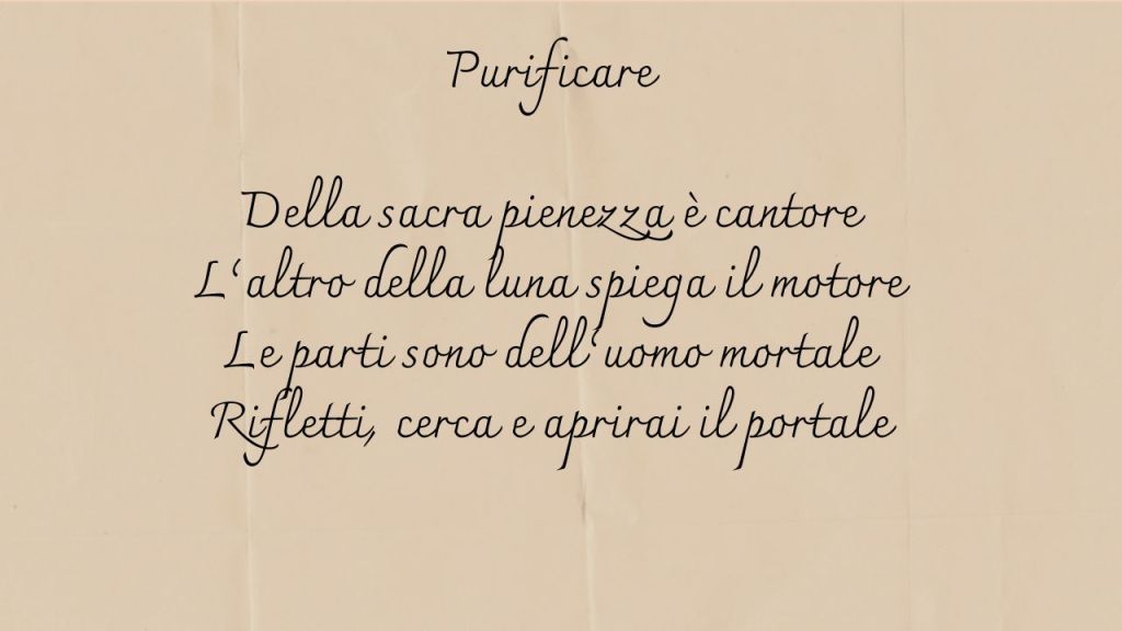 «Ritornerò su questo primo verso. “L’altro della luna spiega il motore”: motore è movimento quindi della luna il motore, potrebbe far riferimento ai cicli della luna. Al numero 4. Sì, potrebbe essere. Il terzo numero mi pare sia scontato: “Le parti sono dell’uomo mortale”. Anima e corpo, la dualità. Il 2. Sicuramente».
