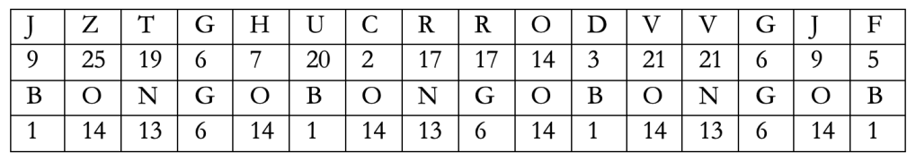 «Vedi, a ogni lettera corrisponde un numero. Per cifrare un messaggio devi sommare il numero corrispondente alla lettera del messaggio al numero corrispondente alla lettera della parola chiave. Per decifrare il messaggio facciamo il procedimento inverso: sottraiamo al numero corrispondente alla lettera del messaggio cifrato il numero corrispondente alla parola chiave».